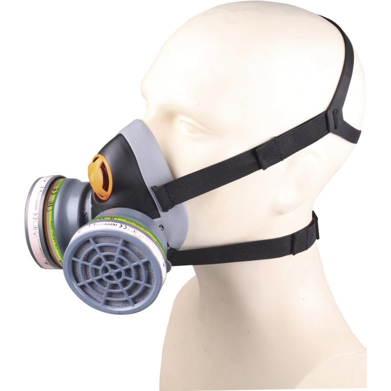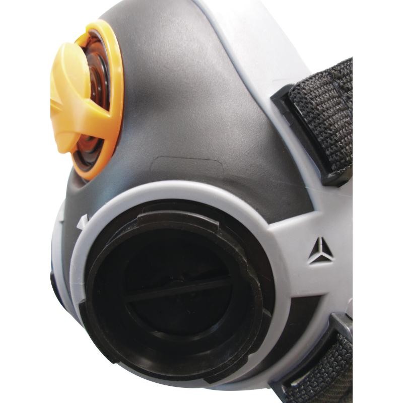 Demi-masque confort bi filtre : Corps du masque en polypropylène (PP) - Surmoulage thermoplastique (TPE). Lanières élastiques