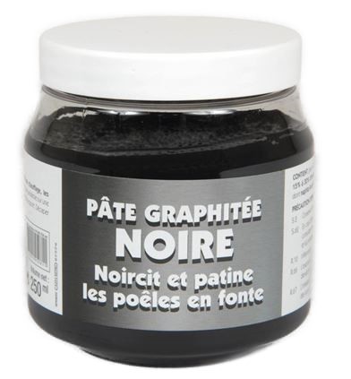 Noircit et patine la fonte, le métal et les joints thermiques pour poêles et inserts (quand ils sont blancs), les chenets, plaques de cheminées, dessus de poêles et cuisinières, entourage d'inserts.